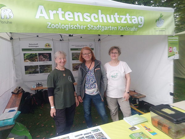Zum 8. Mal konnten wir unseren Verein mit seiner ehrenamtlichen Arbeit für den Amphibienschutz an der B3 beim Artenschutztag im Zoologischen Stadtgarten Karlsruhe vertreten. Zusammen mit dem Naturtreff Grötzingen haben wir den Besuchern veranschaulicht, welche Amphibienarten wir in unserer Region haben, und was wir zu deren Schutz tun. Der Naturtreff hat dazu kleine Molche und Feuersalamanderlarven mitgebracht, von uns wurde stellvertretend für die Gefährdung durch invasive Arten, der Kalikokrebs gezeigt. Die mitgebrachten Spiele, wie „Dalli Klick“ und Ordner mit „Such-das-Tier“ Suchbildern, sowie Fotos unserer heimischen Amphibien und Reptilien, haben Kinder wie Erwachsene begeistert.Auch wenn das Wetter nicht ganz optimal war, kamen viele Besucher und es war wieder ein insgesamt sehr gelungener Tag, auch Dank der perfekten Vorbereitung durch den Zoo.